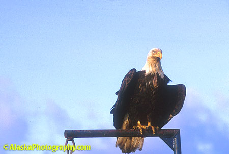 |  See text list of Alaskan birds. | Homer Eagles Contributor: AlaskaPhotography.com May 2000 This photo was taken in Homer Alaska during the Annual Kachemak Bay Shorebird Festival on the Homer Spit. Send this Page to a Friend  Click Here to Send a Postcard Some of the best bald eagles photos taken in Alaska are taken on the coastline and island shores of Southeast Alaska. This is probably as result of the fact that most Alaskan bald eagles feed on fish. Their diet consists mainly of herring, flounder, pollock, and salmon, waterfowl, small mammals, sea urchins, clams, crabs and small waterfowl. |